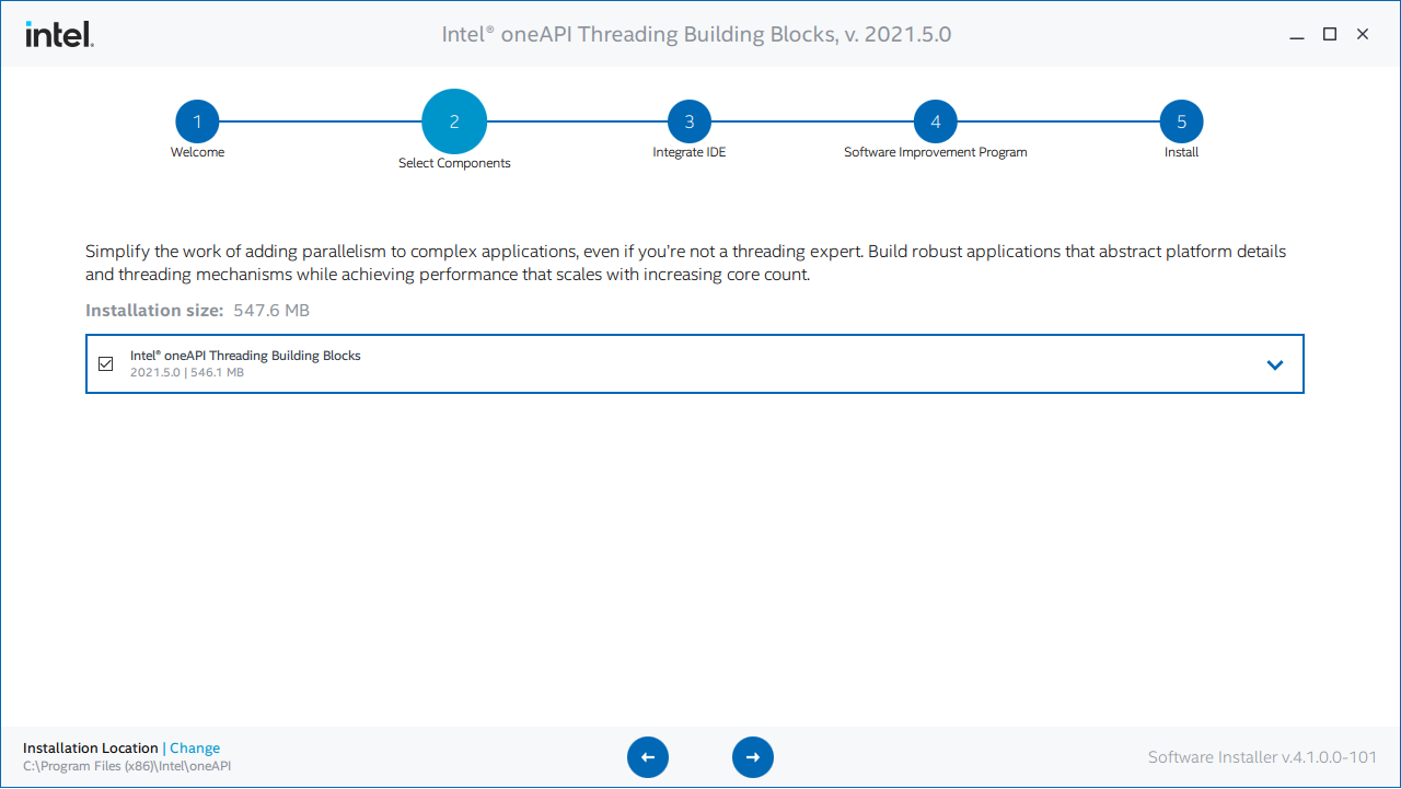 デフォルトのインストール設定を使用するには、[Recommended Installation] を選択します。oneTBB はデフォルトの場所にインストールされます: