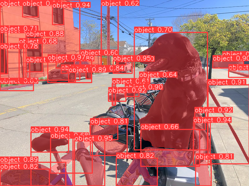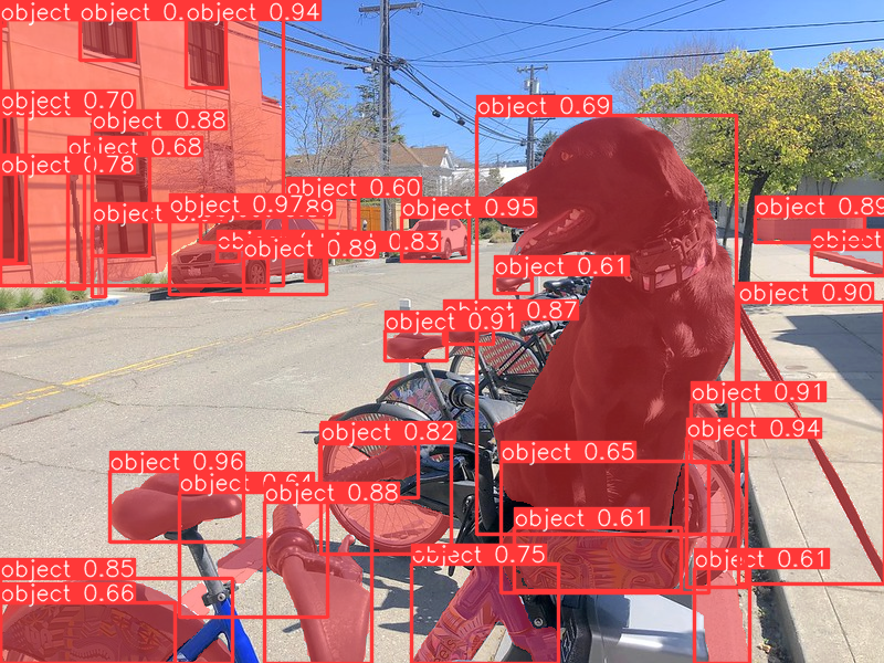 Speed: 3.9ms preprocess, 706.9ms inference, 592.3ms postprocess per image at shape (1, 3, 768, 1024)モデルは、画像上のすべてのオブジェクトのセグメント化マップを返します。以下の結果をご覧ください。