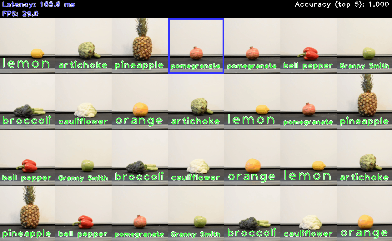 このデモでは、OpenCV を使用して、結果の画像グリッドを表示し、分類結果が画像の上にテキストとして表示されます。デモレポート: