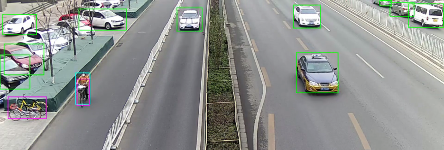 これは、1/16 および 1/8 スケールのフィーチャー・マップからの 2 つの SSD ヘッドと、解像度 512x512 のクラスター化された以前のボックスを備えた MobileNetV2 バックボーンに基づく人物、車両、自転車の検出器です。