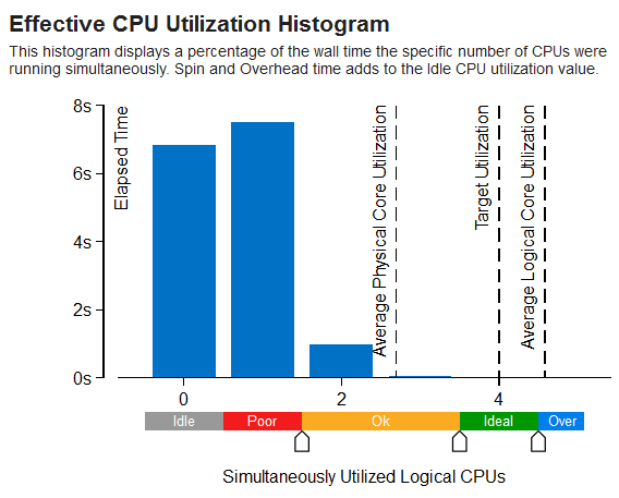 このメトリックは、アプリケーションの並列処理効率を評価します。これは、並列ランタイムシステムによるオーバーヘッドを除く、アプリケーション内で費やされるシステム内のすべての論理 CPU コアの比率を推測します。100% の利用率は、アプリケーションが実行中にすべての論理 CPU コアをビジーに保つことを意味します。