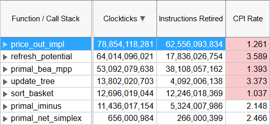 CPI 値がしきい値を超えると、インテル® VTune™ プロファイラーはその値をピンク色でハイライトします。