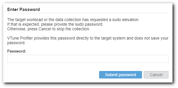 解析中にターゲットのワークロードやコレクターが sudo による昇格を必要とする場合、インテル® VTune™ プロファイラー・サーバーはウェブ・インターフェイスで対話形式のパスワードを要求します: