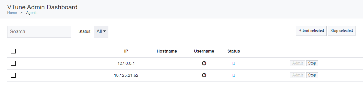 ダッシュボードが新しいタブで開かれ、インテル® VTune™ プロファイラー・サーバーのインスタンスに関連するすべてのエージェントが表示されます。これには、接続されているエージェントと切断されたエージェントの両方が含まれます。