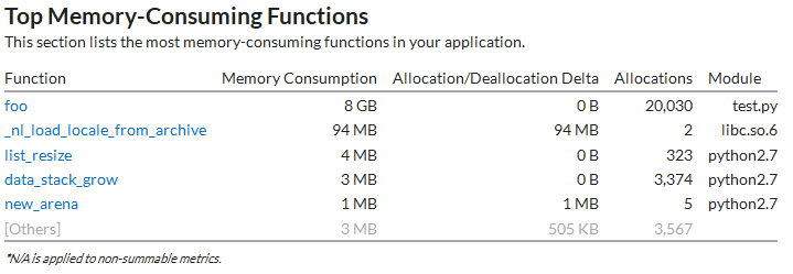 メモリー消費解析は、Linux* ネイティブまたは Python* ターゲットを解析し、メモリー消費量 (RAM) を経時的に調べて、解析中に割り当ておよび解放されたメモリー・オブジェクトを特定します。