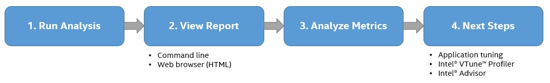 結果の解析に基づいて、適切な次のステップを決定します。一般的な次のステップには、アプリケーションのチューニング、またはインテル® VTune™ プロファイラーやインテル® Advisor などのパフォーマンス解析ツールによる詳しい調査が含まれます。