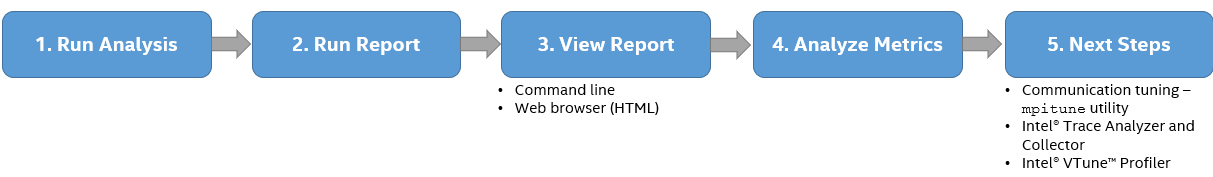 結果の解析に基づいて、適切な次のステップを決定します。一般的な次のステップには、mpitune ユーティリティーによる通信のチューニング、またはインテル® Trace Analyzer & Collector やインテル® VTune™ プロファイラーなどのパフォーマンス解析ツールによるさらに詳しい調査が含まれます。