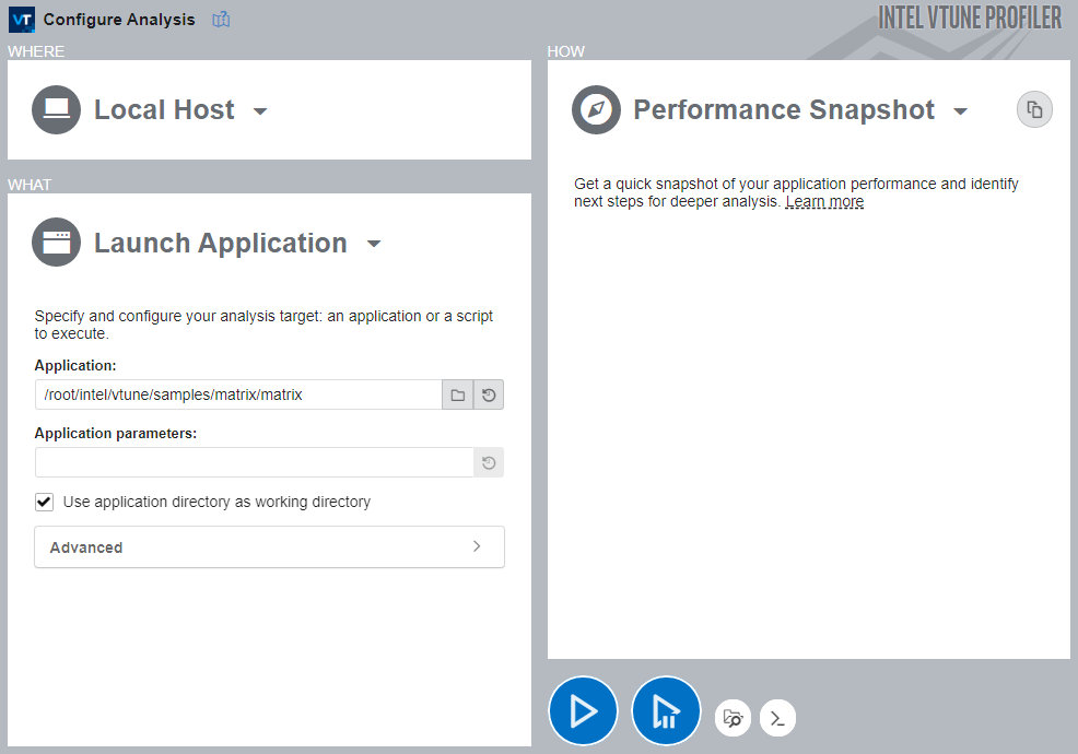 このチュートリアルでは、事前に構築された matrix サンプル・アプリケーションを使用します。自身のアプリケーションを解析する場合、完全な解析を実行する前に、リリースモードで完全に最適化された状態でビルドし、パフォーマンス・ベースラインを取得してください。Linux* ターゲットの準備の詳細については、ユーザー ガイドの 「Linux* ターゲット」 セクションを参照してください。
