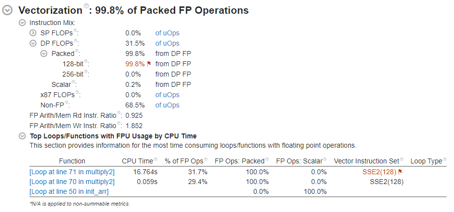 multiply2 関数のメインループは古い SSE2 命令セットを使用してベクトル化され、コンパイルと解析は AVX2 をサポートするプロセッサーで実行されたことに注意してください。そのため、ハードウェア・リソースの一部は十分に活用されていないままです。