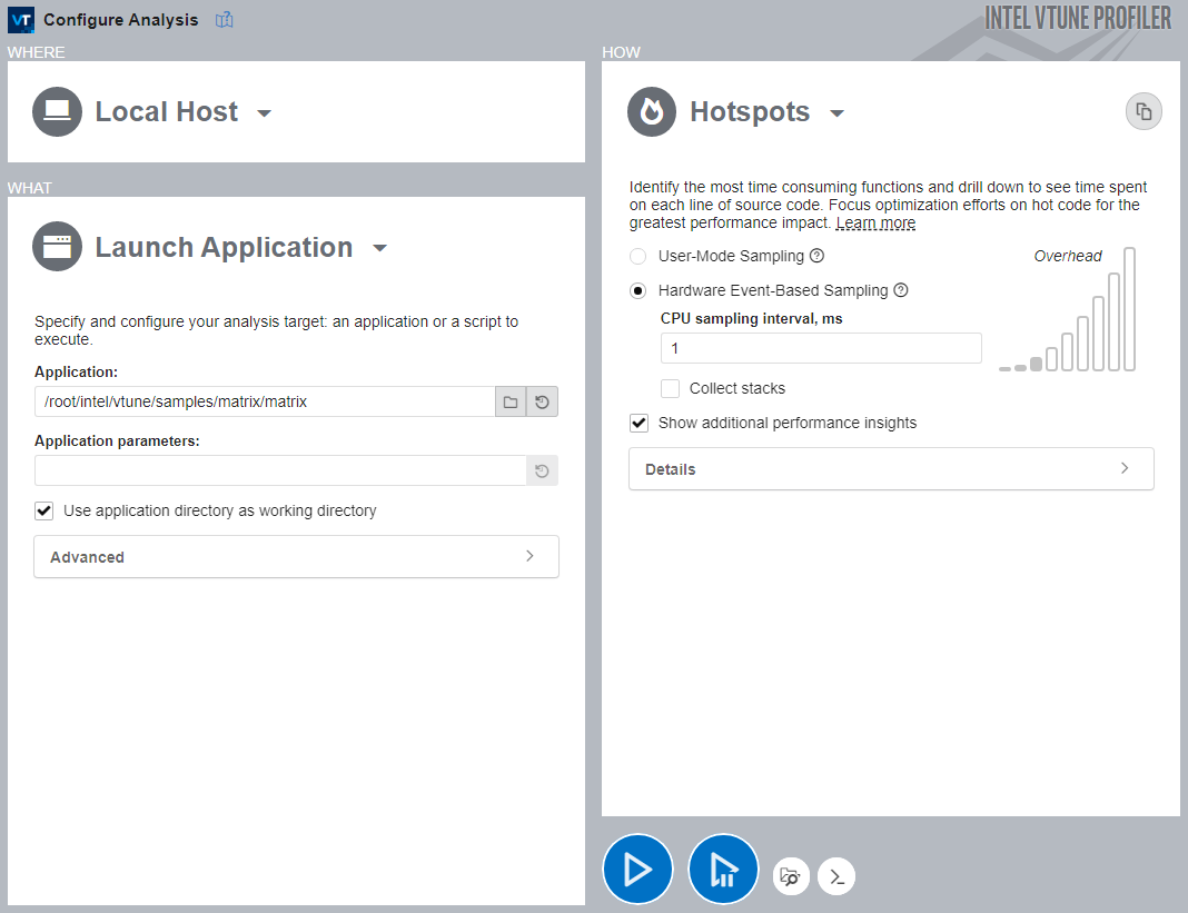 収集モードでは、[User-Mode Sampling] と [Hardware Event-Based Sampling] のどちらかを選択できます。これらのサンプリングの仕組みは異なりますが、通常は、より少ないオーバーヘッドでより詳細な情報が得られるため、可能な場合は [ハードウェア・イベントベース・サンプリング] を使用することをお勧めします。