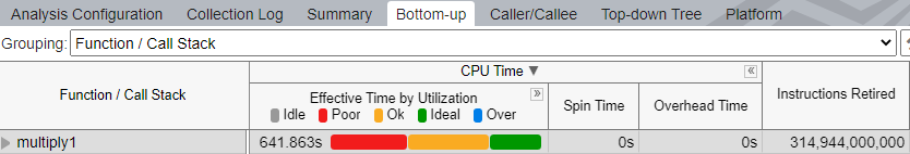multiply1 関数の実行には約 640 秒と最も時間がかかっており、CPU 利用率が低いことがわかります。