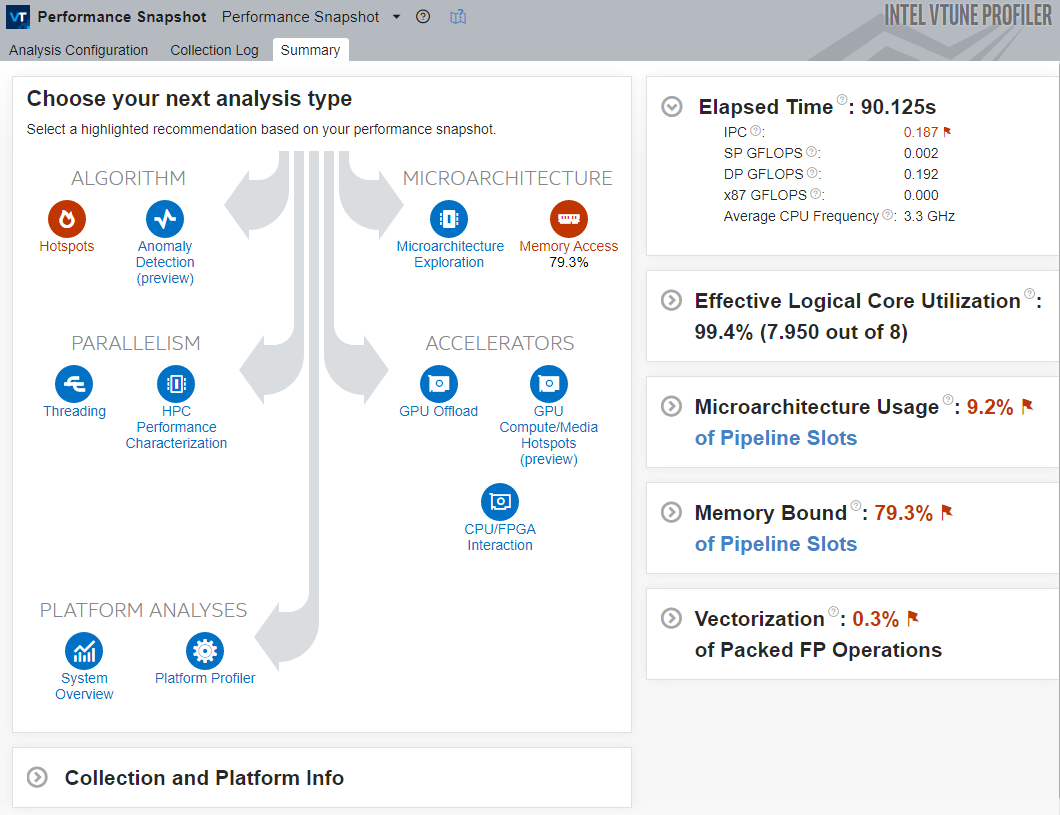 Memory Bound メトリックが高く、メモリーアクセスの問題があることを示しています。そのため、パフォーマンス・スナップショットは、Memory Access 解析を潜在的な開始点としてハイライト表示し、このパフォーマンスのボトルネックが最も深刻であり、Elapsed Time の合計に最も影響していることを示します。