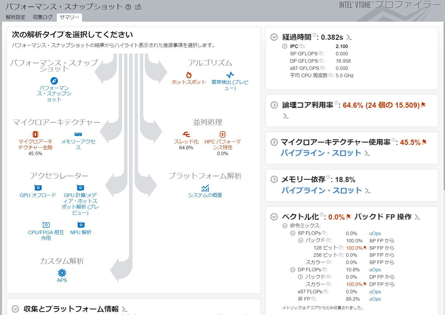 ベクトル化メトリックは 0.0% であり、コードがベクトル化されていないことを示しています。そのため、パフォーマンス・スナップショットでは、HPC パフォーマンス特性解析が次のステップとしてハイライトされています。
