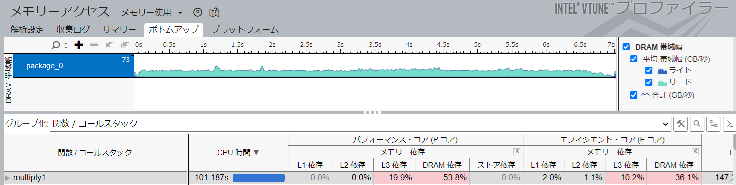 LLC (L3) ミスカウントのメトリックが非常に高いことに注意してください。これは、アプリケーションがキャッシュを有効に活用しないメモリー・アクセス・パターンを持っていることを示しています。これにより、プロセッサーが LLC (L3) を頻繁にミスし、DRAM からデータを要求しするためレイテンシーの点でコストがかかります。