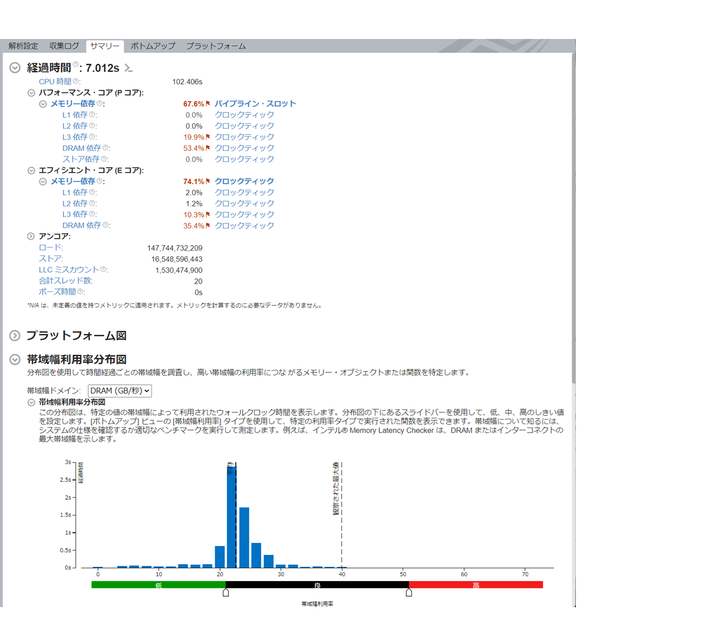 ここでも、アプリケーションはメモリーアクセスに依存していることに注意してください。システムが DRAM 帯域幅だけに制限されないということは、アプリケーションが飽和した物理 DRAM 帯域幅ではなく、頻繁に小さなメモリー要求によって制限されていることを示しています。