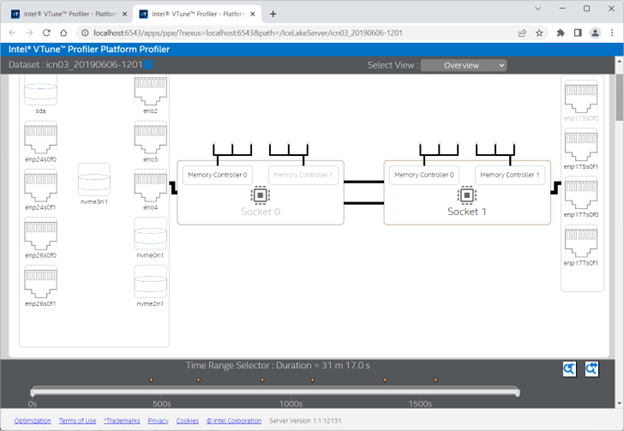 次に、収集したデータをプラットフォーム・プロファイラー・サーバーにインポートします。プラットフォーム・プロファイラー・サーバーを使用して、システム動作のパフォーマンス概要を調査します。計算、メモリー、ストレージ、I/O、および相互接続に関連するプラットフォーム・レベルの構成、利用率およびインバランスの問題を理解します。