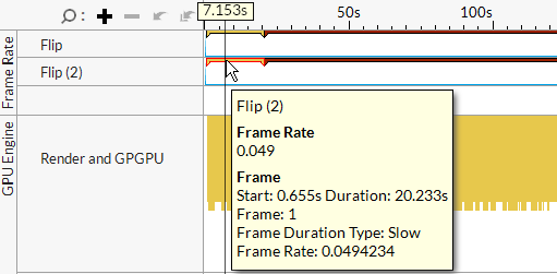 フレームの持続時間、フレームレートなどのデータを含むサマリーを表示するには、フレーム・オブジェクトにカーソルを移動します。 ![]() 同じ ID の CPU と GPU フレームは同一色で表示されます。 |