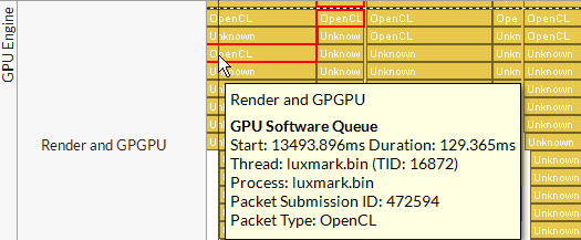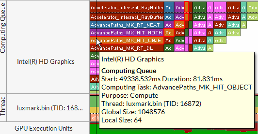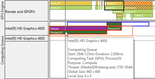 計算キュー: OpenCL* カーネル・サブミッションの詳細では、サブミッションと実行の順序に注目し、キューで費やされた時間を特定して、計算キューのデータにズームして解析します。インテル® VTune™ プロファイラーは、同じ名前とグローバル/ローカルサイズのカーネルを同色で表示します。Windows* 同期タスクは、縦縞 カーネルタスクをクリックすると、トップレイヤーに表示された実行に対応するキュー全体がハイライトされます。カーネルの実行パラメーターを見るには、キューのオブジェクトにマウスカーソルを移動します。 ![]() Windows* のみ: ![]() Windows* では、OpenCL* デバイスキュー (オレンジ) の実行パス (青) と DMA パケット・ソフトウェア・キュー (黒) の関連性を調査できます。OpenCL* カーネルキューは、異なるタイプの DMA パケットが単一の DMA キューを多重化するドライバーで処理されます。上記の例では、レンダーと GPGPU キューは、グラフィックス (GHAL3D) と計算 (OpenCL*) からの両方のパケットを処理します。 |