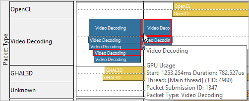 GPU エンジン: 各時点の GPU エンジンごとの GPU 利用率の概要を調査します。デフォルトで、[プラットフォーム] ウィンドウには GPU 利用率と GPU エンジンごとのソフトウェア・キューが表示されます。GPU で実行されるオブジェクト (黄色) にカーソルを移動すると、GPU 利用率の簡単なサマリーが表示されます。GPU 利用率は、GPU エンジンがワークロードを実行していた時間です。グラフの GPU 利用率を調査して、GPU エンジンの利用率 (黄の領域と空白) とハードウェアに追加のワークを送信する可能性を推測できます。 GPU ソフトウェア・キューを表示して解析するには、キュー内のオブジェクト (パケット) を選択すると、インテル® VTune™ プロファイラーは対応するソフトウェア・キューをハイライト表示します。 ![]() ソフトウェア・キューが一杯になると、パケットの送信が抑制され、キューに空きができるまでユーザーモードのドライバーは CPU 側で待機します。このようなストールによってパフォーマンスが低下する可能性を確認するには、ハードウェアの負荷を減らして [グラフィックス] ウィンドウに切り替え、パケットを生成するスレッドの CPU 待機時間が少なくなっているか確認します。別の方法として、タスクによってキューに追加の負荷をかけ、キューの長さが増加するかを確認できます。 [プラットフォーム] ウィンドウのパケットは、ソフトウェア・キュー内のライフサイクルを追跡するのに役立つ 個別の ID を持ちます。ID はレンダリングされたフレームには対応していません。ポップアップで示されるスレッド名 (スレッドの開始点があるモジュール名に対応) によって、パケットの送信元を特定できます。 収集の問題 (例えば、インテル® グラフィックス・ドライバーからのイベントの欠落など) が原因でデータの正確性を欠くデータでは、水平の平行線が示されます。このタイプのデータは、凡例 (レジェンド) では再構成されたパケットとして識別されます。 Windows* のみ: Windows* ターゲットの場合、凡例 (レジェンド) で [パケットタイプ] ドロップダウン・メニューを選択して、DMA パケットドメインごとの GPU 利用率とソフトウェア・キューを調査できます。 ![]() Windows* ターゲットでは、現在は赤い平行線で表示されます。 |