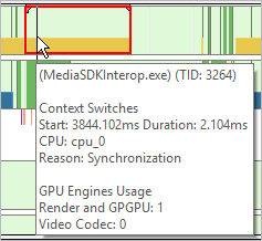 スレッド: スレッドの CPU 利用率を調査します。[プラットフォーム] ウィンドウには、スレッド関数が含まれるモジュール名としてスレッド名が表示されます。例えば、myFoo 関数が MyMegaFoo 関数に属する場合、スレッド名は MyMegaFoo です。この手法は、タイムライン上に表示されるワークを生成するスレッドコードの場所を特定するのに役立ちます。 コードでタスク API を使用してタスク領域をマークするか、特定のイベントを監視するためシステムタスクを有効にした場合、タイムラインにはタスク・オブジェクトが表示されます。オブジェクトにカーソルを移動すると、オブジェクトの詳細が表示されます。 ![]() Windows* のみ: マウスカーソルをコンテキスト・スイッチ領域に移動すると、持続時間、理由、影響する CPU の詳細を見ることができます。濃い緑色で示されるコンテキスト・スイッチは、スレッドがワークロードでビジー状態の時間範囲を示し、薄い緑色のコンテキスト・スイッチは、スレッドが同期オブジェクトを待機している範囲を示します。灰色の範囲は、OS のタスク・スケジューラーが、優先順位の高い別のスレッドを実行するため、スレッドをプロセッサーから切り離すプリエンプションによって発生する非アクティブ範囲を示します。 ![]() CPU と GPU 利用率を関連付け、アプリケーションが CPU または GPU のどちらに依存しているか判断します。GPU エンジン利用率バーは、GPU タスクに起因する CPU スレッド上の DMA パケットを表示します。このバーは、GPU エンジンのタイプによって色分けされます (下記の例の黄色のバーはレンダーと GPGPU に対応します)。[プラットフォーム] ウィンドウの [GPU エンジン] 領域にシステム内のすべてのスレッドとプロセスの合計 GPU 利用率を表示する場合、スレッド領域の GPU エンジン使用バーには特定のスレッドによる GPU エンジン利用率が表示されます。 |