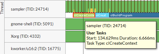 ITT API タスク、Ftrace/Systrace イベントタスク、SYCL* および OpenCL* API タスクなどのユーザータスクのアプリケーション・パフォーマンスを調べます。