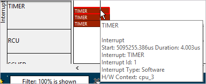 割り込み: システム割り込みが発生した間隔を特定します。ポップアップに詳細を表示するには、割り込みオブジェクトにカーソルを移動します。 ![]() 注解析タイプの設定で対応する Ftrace イベントの収集を有効にした場合、このタイプのデータはカスタムデータ収集結果に表示されます。 |