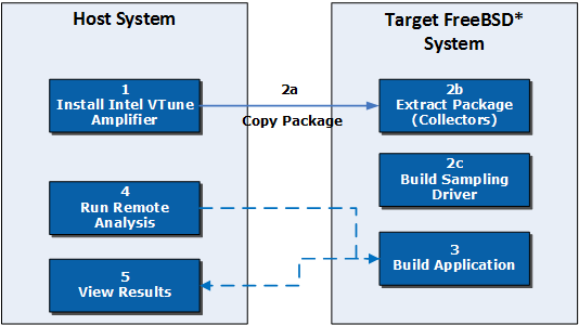 インテル® VTune™ プロファイラーは、FreeBSD* ターゲットシステムにはインストールされていません。代わりに、インテル® VTune™ プロファイラーは Linux*、Windows*、または macOS* ホストシステムにインストールし、リモートの FreeBSD* ターゲットシステムでイベントベースのサンプリング・データを収集するターゲットパッケージを使用できます。