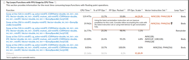 [CPU 時間による FPU を使用する上位のループ/関数] には、CPU 時間でソートされた浮動小数点演算を含む上位の関数を示し、ベクトル化されたコードの割合、ループ/関数で使用されたベクトル命令セット、ループタイプを簡単に予測できます。