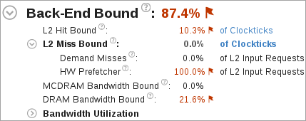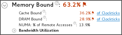 高い DRAM 帯域幅依存 や MCDRAM 帯域幅依存 値は、経過時間の大部分が高い帯域幅利用率に費やされていることを示します。高い DRAM 帯域幅依存 値は、可能であれば、メモリーアクセス解析を実行して、高帯域幅メモリー (MCDRAM) に割り当てるデータ構造を識別します。