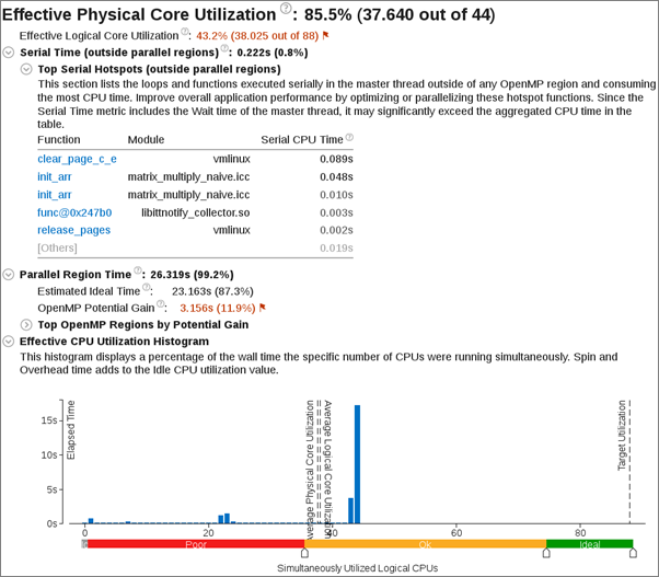 OpenMP* 解析収集時間: プログラムのシリアル領域 (並列領域外) と並列領域のメトリックを表示します。シリアル時間が長い場合、[上位のシリアル・ホットスポット] を確認して、並列処理を導入するか、並列化が困難なシリアル領域ではアルゴリズムやマイクロアーキテクチャーのチューニングを行って、シリアル実行を短縮することを検討してください。スレッド数の多いマシンのシリアル領域は、潜在的なスケーリングに深刻な悪影響を与えるため (アムダールの法則)、可能な限り最小にすべきです。