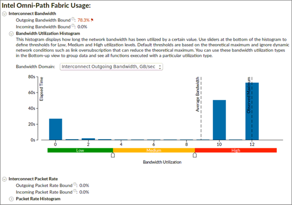 [帯域幅利用率分布図] は、インターコネクト帯域幅が特定の値 (帯域幅ドメイン) で使用された時間を表し、帯域幅利用率を、高、中、低、に分類するしきい値を提供します。