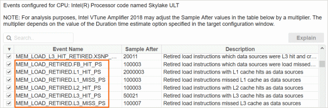 [解析の設定] ウィンドウの [どのように] 設定ペインで、イベントがプリサイスであるか確認します。通常、プリサイスイベントには、次のように [説明] カラムに _PS サフィックス (MEM_LOAD_RETIRED.FB_HIT_PS など) が付きます。