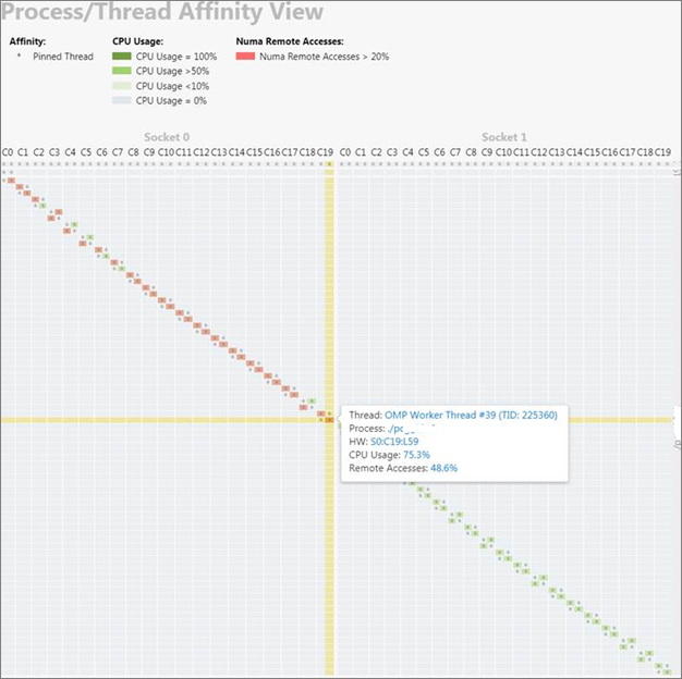 スレッド・ピニング・アフィニティーは、MPI などの並列ランタイム、環境変数、または並列ランタイムやオペレーティング・システムが提供する API を使用して適用できます。HPC パフォーマンス特性解析のアフィニティー収集を有効にするには、インテル® VTune™ プロファイラーの GUI のスレッド・アフィニティーを収集 knob やコマンドラインで-knob collect-affinity=true を使用します。このオプションを有効にすると、ソケット、物理コア、および論理コアへのスレッドのピニングを示すスレッド・アフィニティー・コマンドライン・レポートを生成できます。アフィニティー情報は、スレッドのライフタイムの最後に収集されるため、結果として得られるデータは、スレッドのライフタイム中に変更された動的なアフィニティーの問題全体を示すものではありません。