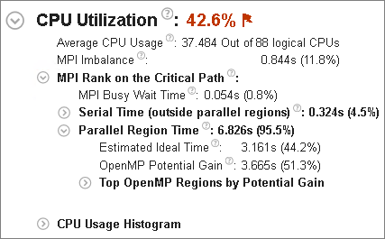 サブセクションの [クリティカル・パス上の MPI ランク] には、シリアル時間 (OpenMP* 領域外)、並列領域時間、および OpenMP* 潜在的なゲインなどの OpenMP* 効率メトリックが表示されます。最小 MPI ビジー待機時間が顕著である場合、それはランク間の最適な通信スキーマ、またはほかのノードで引き起こされるインバランスが原因である可能性があります。この場合、通信スキーマの詳細な解析にインテル® Trace Analyzer & Collector を使用します。 |