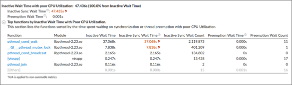 コンテキスト・スイッチ情報はコールスタックで収集されるため、呼び出しパスと待機関数による非アクティブな待機時間を原因を調査できます。ハードウェア・イベントベースのサンプリングとコンテキスト・スイッチ・モードは、同期オブジェクトや I/O 操作によって待機するコード内の場所を示します。