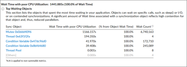 アプリケーションの有効な CPU 利用率を調査して、同期や並列ワーク割り当てのオーバーヘッドに関連する低い利用率の原因を特定するには、[サマリー] ウィンドウから開始します。フラグが示される問題に関連したリンクをクリックすると、詳しい情報が表示されます。例えば、上位の待機オブジェクトテーブルの同期オブジェクトをクリックすると、[ボトムアップ] ウィンドウのそのオブジェクトに移動します。