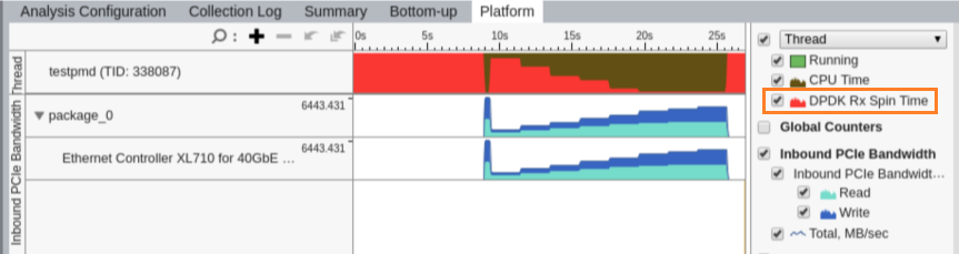 [プラットフォーム] タブで、DPDK Rx スピン時間 メトリックをスレッド単位でタイムライン上に表示します。
