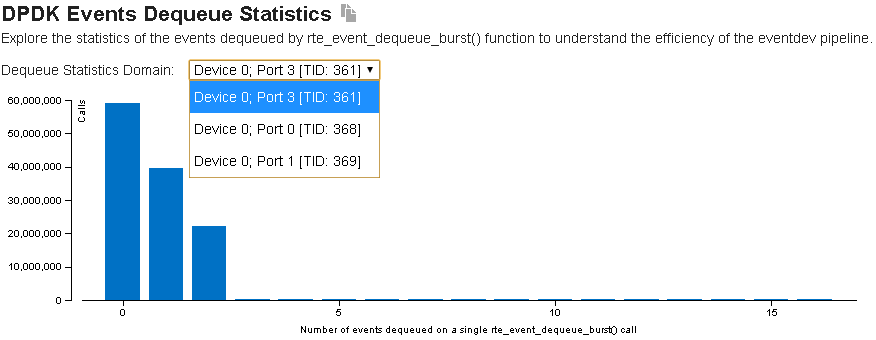 この分布図は、DPDK eventdev ライブラリーからのパケット (イベント) デキュー操作のバッチ統計を表します。これは、イベントデバイスをポーリングするそれぞれのワーカースレッドを表し、各イベント・デバイス・ポートの統計情報を示します。分布図を調査して、インバランスな負荷分散、オーバーサブスクリプション、または利用されていないワーカースレッドを特定します。
