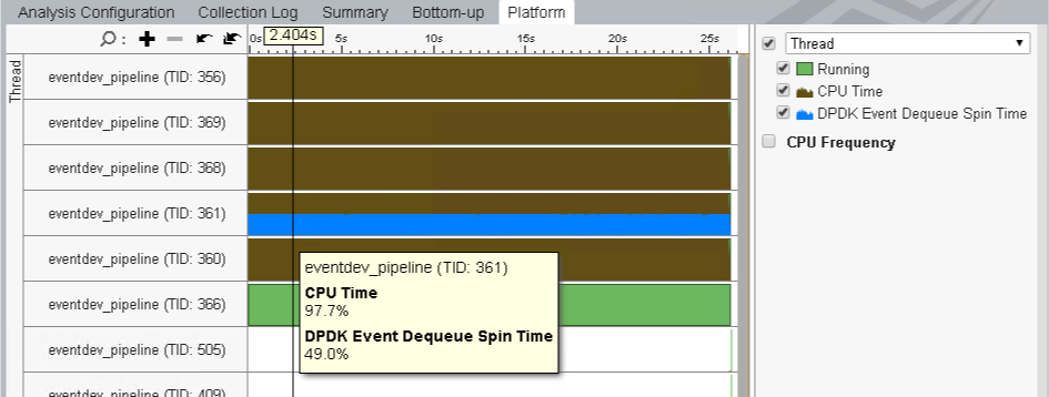 [プラットフォーム] タブに移動し、タイムライン上のDPDK イベント・デキュー・スピン時間メトリックを調査します。ワーカーごとのデキュー統計は、ロードバランスの詳細を明確にし、パイプライン構成の効率を解析してパイプラインのボトルネックを特定することを可能にします。