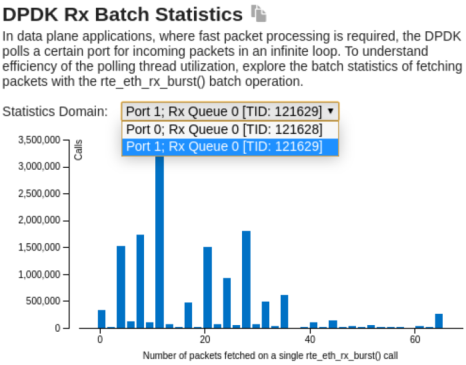[サマリー] タブから開始し、DPDK Rx バッチ統計 分布図を調査すると、パケット取得バッチのサマリー統計と Rx コア利用率の完全な特性を確認できます。分布図は、特定の Rx キューに関連付けられたポーリングスレッドで利用できます。