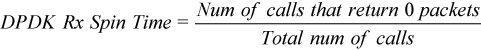 あるコアでポーリングループが実行されている間、DPDK がアイドル状態で費やすループサイクル数に関わりなく、このコアの CPU 時間 メトリックは常に 100% 近くになります。そのため、CPU 時間 メトリックは、パケット取得でコアがどのように利用されているか確実に識別することはできません。このポーリングモデルでは、より適切な利用率メトリックは、無駄なポーリング・ループ・サイクルの比率である Rx スピン時間 であるかもしれません。無駄なサイクルとは、DPDK がパケットを受信しないループ反復です。