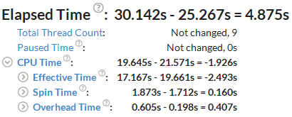 CPU 時間が 19,645 秒から 21,571 秒に増加したにもかかわらず、2 番目の結果のコードの変更がベースライン (result1) と比較してアプリケーションの経過時間をわずかに減少させたことが分かります。