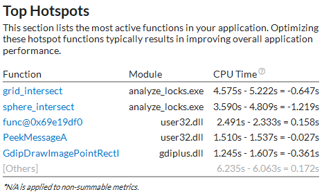 比較モードでは、上位のホットスポットセクションに、指定した結果のオブジェクトごとのパフォーマンス値の差分 (オブジェクト・タイプはビューポイントに依存) が表示されます。次の例では、インテル® VTune™ プロファイラーは最も時間がかかる関数の CPU 時間の差を (結果タブのタイトルに示すとおり) r000hs 値 - r004hs 値として表示します。