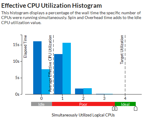 このグラフでは、2 番目の結果でプロセッサーの利用率が低いときに、費やされた経過時間がわずかに増えていることが分かります。これは、2 回目の実行での変更がプロセッサー・コアの利用率を最適化するのではなく、合計経過時間を短縮する最適化が行われたことを意味します。