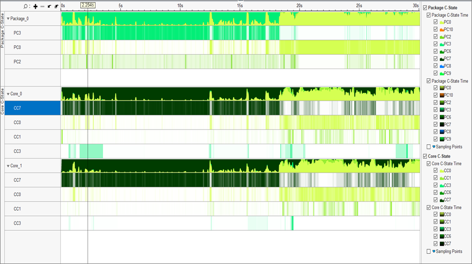 タイムライン・ビューを使用して、ステートの遷移がいつ発生したか調べます。チャートのポイントにカーソルを移動して、特定時間のスリープステートの詳細を確認します。チャートの色が濃いほど CPU のスリープステートが深いことを示しています。グラフ領域を選択してズームインし、スリープステートの遷移の詳細を確認します。