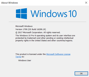 > winver例えば、Version 1709 は、サポートされている Windows* 10 Fall Creators アップデート (RedStone3) が実行されていることを示します。