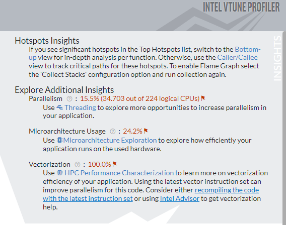 解析をデフォルトの [追加のパフォーマンス情報を表示] オプションで実行した場合、[サマリー] ビューにはハードウェア利用やベクトル化の効率など、ターゲットの追加メトリックを示す [詳しく調査] セクションが含まれます。この情報は、パフォーマンス解析の次のステップを明らかにし、最適化作業に集中すべき場所を特定するのに役立ちます。