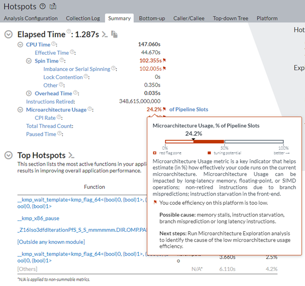 [ハードウェア・イベントベース・サンプリング] モードでホットスポット解析を実行すると、[サマリー] ウィンドウの解析メトリックにはマイクロアーキテクチャー使用メトリックが表示されます。このメトリックを使用して、ハードウェア・プラットフォーム上のコア効率を予測します。