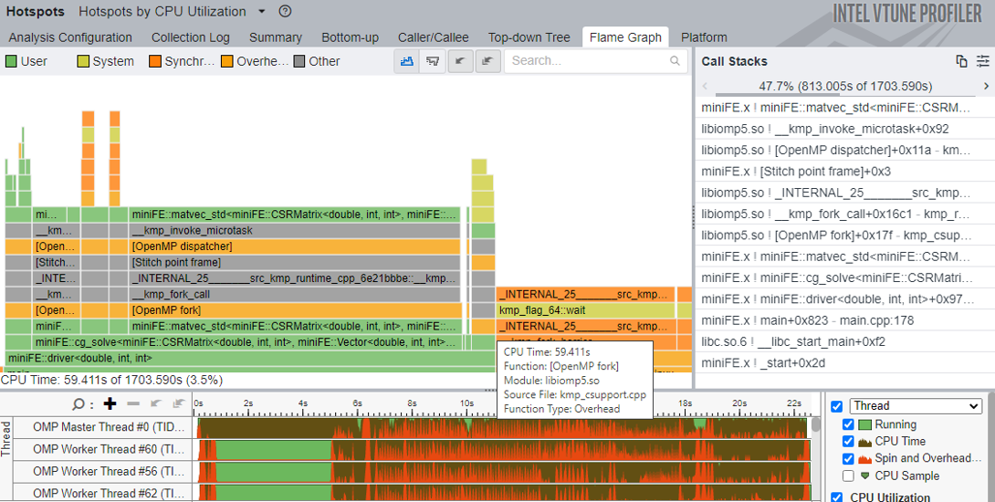 経過時間値をベースラインとして、最適化前後のバージョンを比較します。アプリケーションをチューニングする時に、スレッド数を増やすと経過時間は減少する傾向がありますが、CPU 時間は増加する可能性があります。