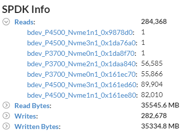 全体の IO パフォーマンス統計については、SPDK 情報セクションを参照してください。各デバイスが操作やメトリックごとでどのように実行されたか確認するには、対応するブロックを拡張して SSD 間の潜在的な IO パフォーマンスのインバランスを特定します。